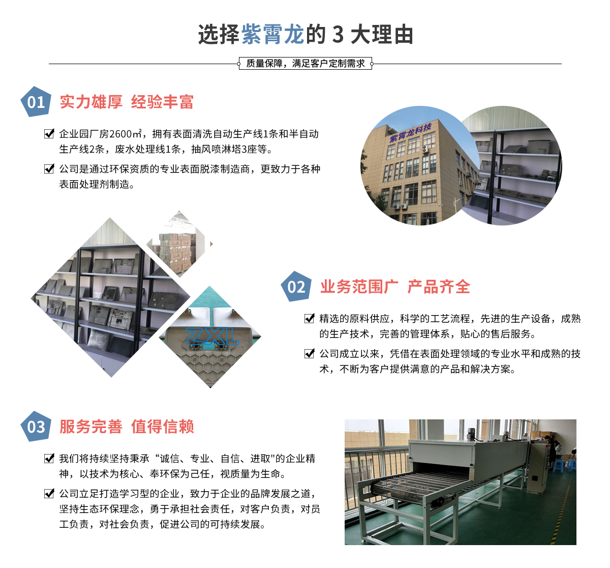 - 安徽紫霄龍科技發(fā)展有限公司成立于2017年,在安徽省舒城縣杭埠經(jīng)濟(jì)開(kāi)發(fā)區(qū)工投企業(yè)園廠(chǎng)房2600㎡,建設(shè)脫漆、皮膜、脫脂、除油洗白等表面清洗自動(dòng)生產(chǎn)線(xiàn)1條和半自動(dòng)生產(chǎn)線(xiàn)2條,廢水處理線(xiàn)1條,抽風(fēng)噴淋塔3座等,采用水、表面活性劑處理工藝,形成金...
